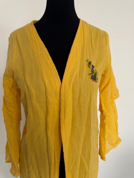 مانتو زرد نخی به همراه گلر سینه طاووس